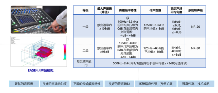 设计参考《厅堂、体育场馆扩声系统设计规范》(GBT 28049-2011)的指标,根据需求,按照厅堂多用途类扩声系统声学 特性指标的一级标准设计。