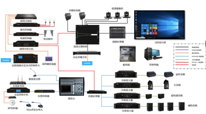 根据现场情况且满足客户需求的同时,在相关区域安装固定话筒和无线话筒满足讲演和娱乐的要求,并配合调音台、效果器、均衡器并防止啸叫,满足音响和扩采用立体声扩声,实现左右完全覆盖、声像定位功能,再加上辅助补满整个会场保证声场均匀,满足扩声需求,清晰还原人声满足会议需求。